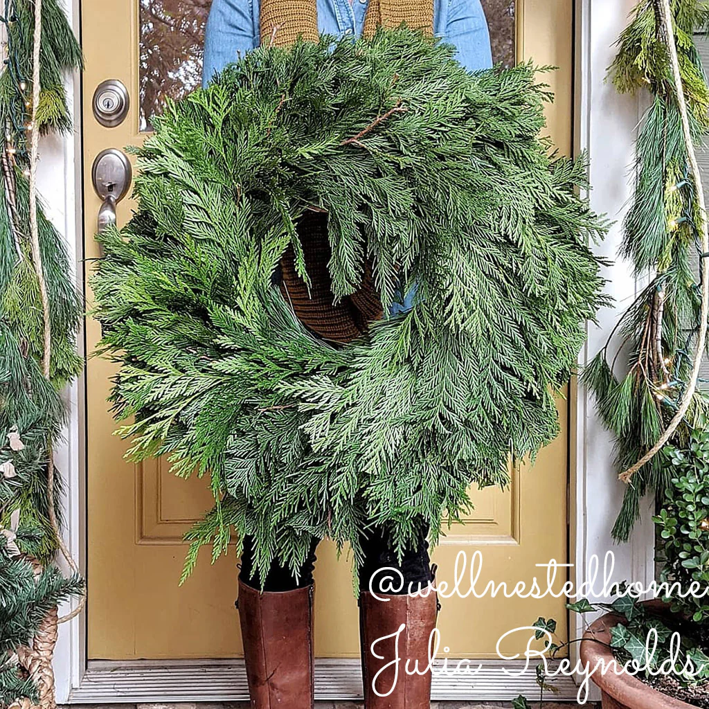 Our Three Cedars wreath is made fresh daily with cedar picked from the foothills of the Olympic Mountains. The fragrance of this mixed cedar wreath will invoke the Pacific Northwest spirit throughout your home. The wreath base is made of western red, incense, and Port Orford cedars and is finished with tightly woven white pine. Cedar boughs are naturally more droopy and less stout compared to other evergreens, so this wreath has a loose, relaxed, and more flowing style than those made with noble fir. This simple, natural wreath is well-loved and one of our farm favorites. Also offered with a gorgeous deep red brushed-linen bow. Available in 26" & 32" sizes. 4-Packs contain four 26" wreaths and ship to one address.