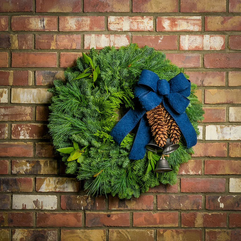 Materials: noble fir, incense cedar, white pine, and California bay leaves with 6"- 8" white pine pinecones, burnished silver bells hanging from a jute string, and a navy blue brushed linen bow